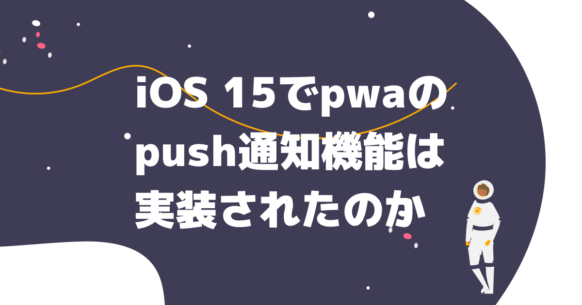 結論iOS 15では、まだpush通知機能は実装されてないみたいです。Appleの公式ページや海外の掲示板でPWAに関する情報を集めて見ましたが、iOS 15ではPWAに目立った変化はないようです。AndroidやWindowsでは既にPWAでPush通知出来るので、iOSにPush通知したい開発者は少なくないはず。iOS 16に期待。間違い、追加情報があったら更新します。参考iOS 15で利用できる新機能。 | AppleIs there any improvement to PWA on iOS 15? | reddit